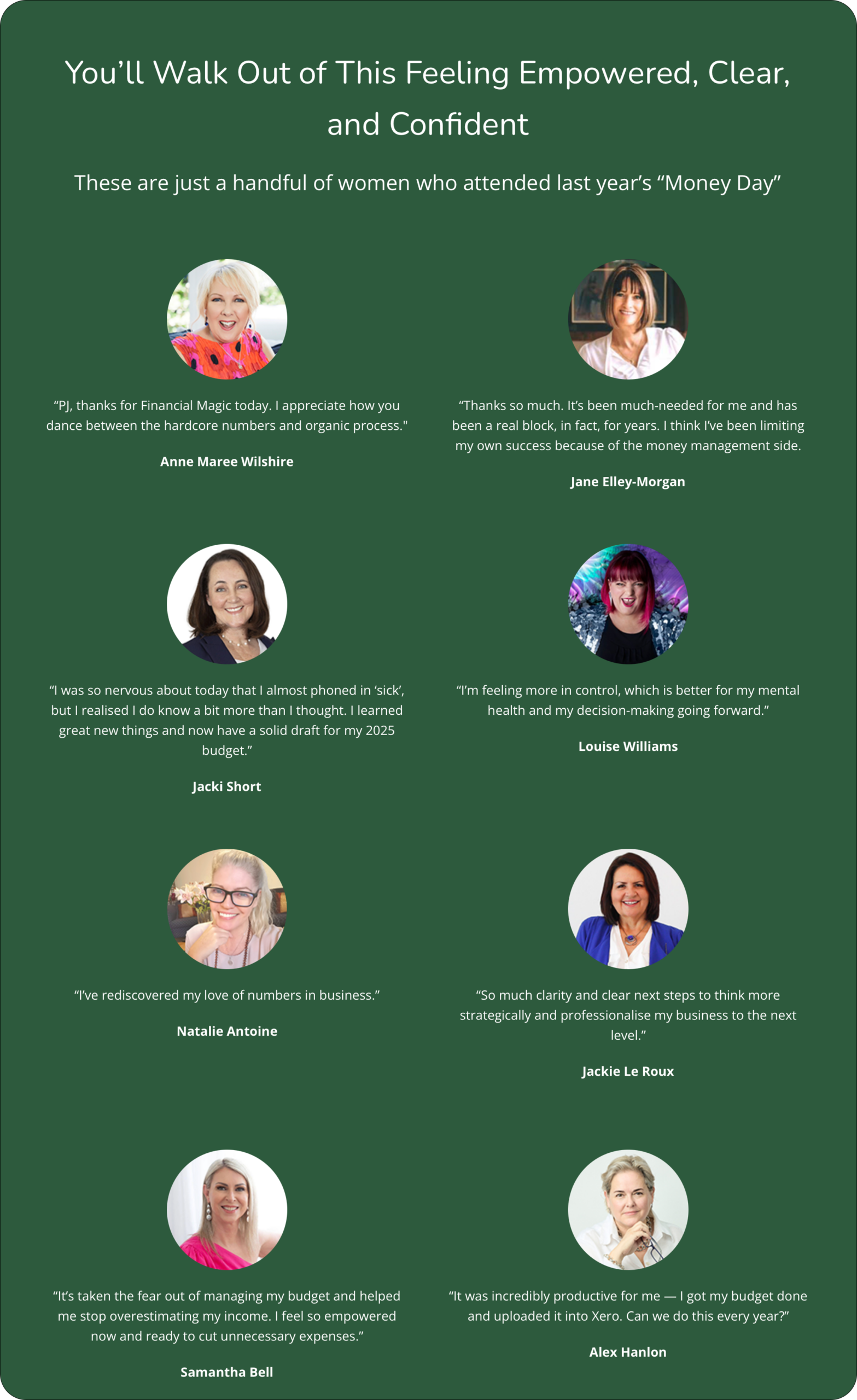 | Understand how your money really works — without jargon or overwhelm. | Sense-check your numbers so they feel achievable, sustainable, and worth going after. |